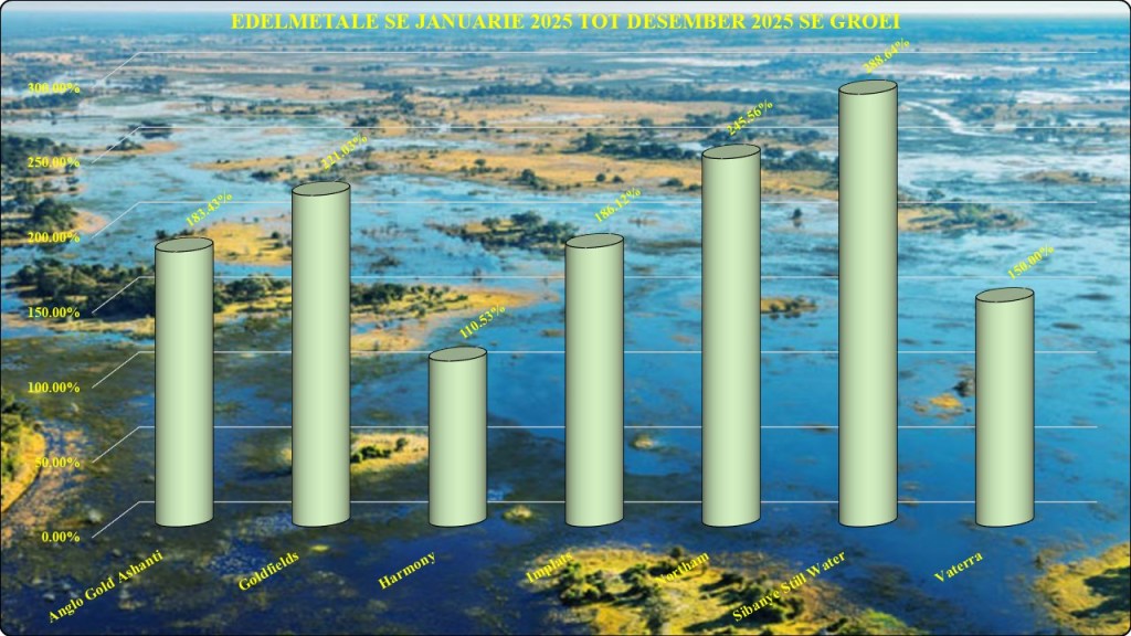 Hier het Sibanye Stillwater met ‘n 288.64% uitgestaan tussen die skare, terwyl Harmony wat die laagste is nogsteeds ‘n 110.53% opgelewer het. Die gemiddelde opbrengs van die sewe(7) edel metale was 197.90% vir dir jaar 2025.